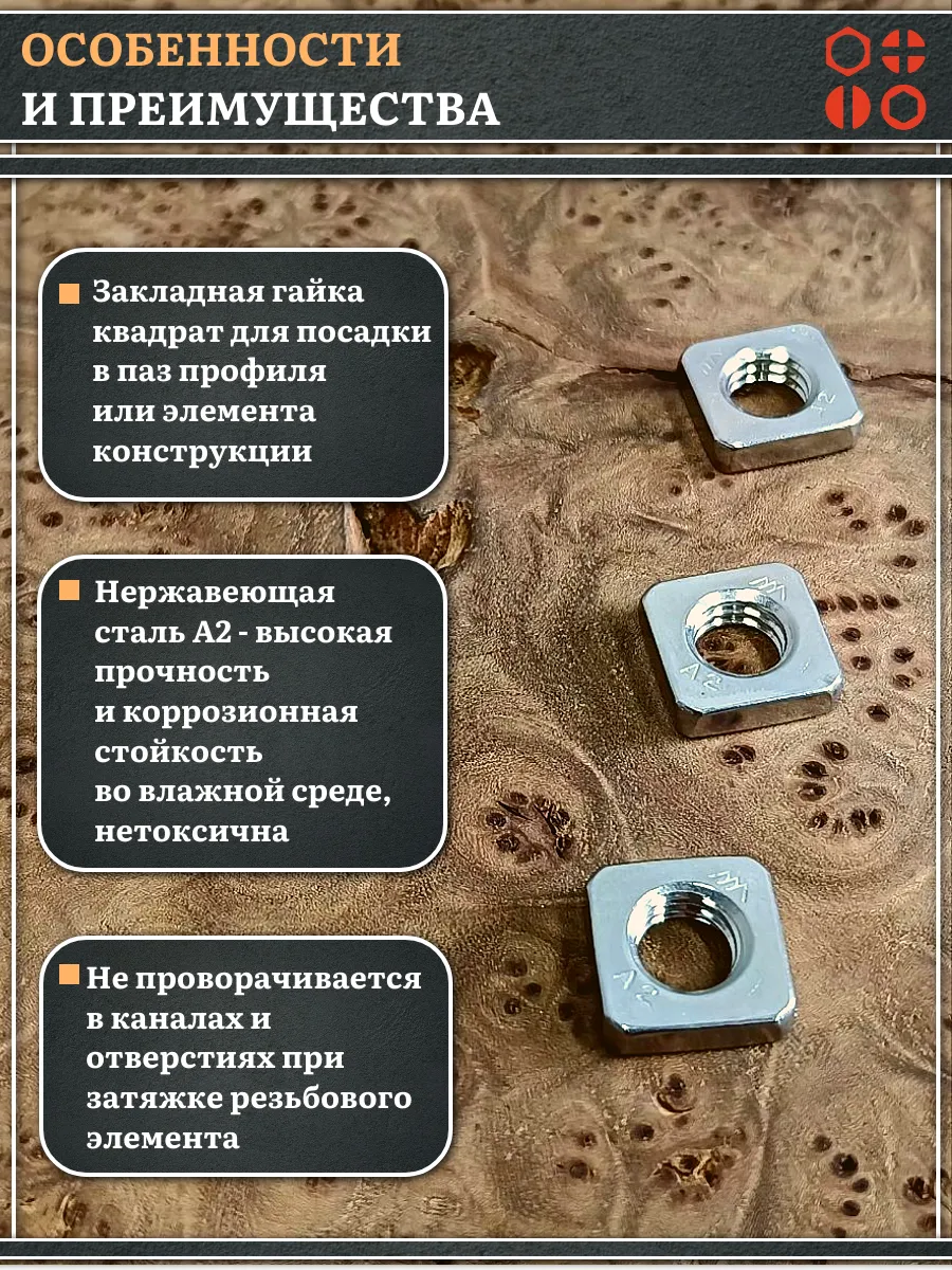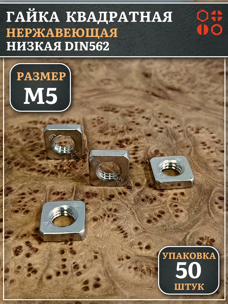 Гайка квадратная М5 нержавеющая низкая DIN562, 50 шт.