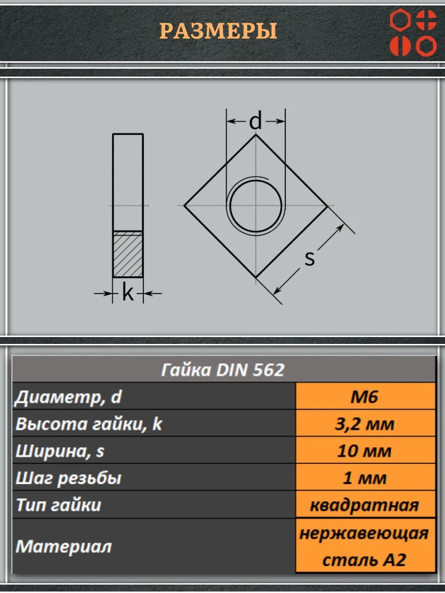 | Гайка квадратная М6 нержавеющая низкая DIN562, 20 шт. | 00-00005721ф20 | 1 шт. |