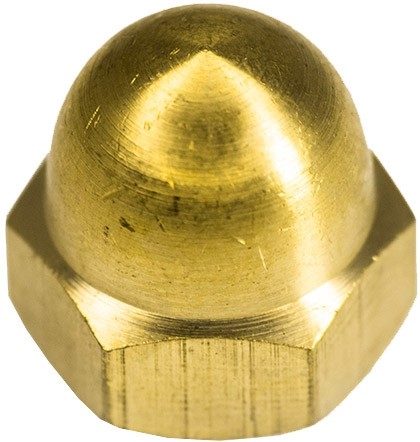 Гайка декоративная колпачковая, латунная DIN 1587 накручивается на выступающие концы шпилек и болтов, выполняя одновременно крепежную, декоративную и защитную функцию. Может применяться в качестве контргайки вместе с основной стандартной гайкой. Она имеет основание шестигранной формы для затягивания обычным гаечным ключом, фаску на открытом торце и слегка вытянутый сферический элемент, что относит ее к категории высоких глухих колпачковых гаек. В закрытом резьбовом отверстии накатана метрическая крупная резьба М3 - М24. Изделие изготовлено из высококачественного латунного сплава, легирующие компоненты которого, не лишая крепеж пластичности, придают ему достаточно высокую прочностью и износостойкость. Предотвращает попадание влаги в резьбовое соединение и ограждает пользователя от острых кромок торчащих стержней.