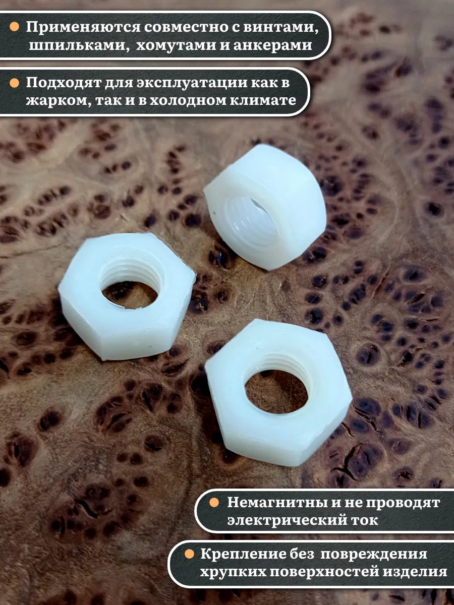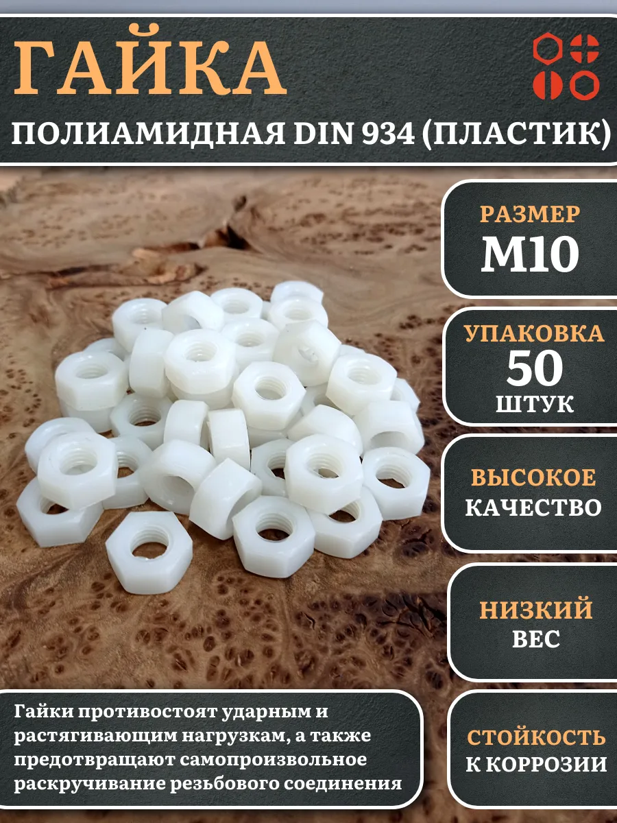 Гайки из пластика, изготовленные из полиамида и соответствующие стандарту DIN 934, используются для предотвращения самопроизвольного раскручивания резьбовых соединений. Вместе с ними применяют полиамидные шайбы, которые служат в качестве уплотнительной прокладки. Это позволяет увеличить площадь контакта и защитить соединяемые детали от повреждений.