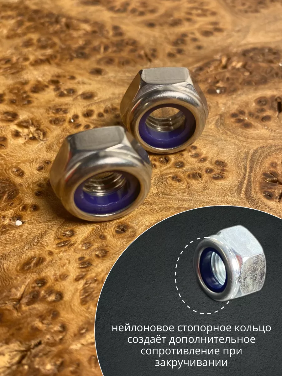 Стопорная самоконтрящаяся гайка DIN 985 с нейлоновым кольцом из нержавеющей стали А2 используется в машиностроении, приборостроении и прочих промышленных, производственных, строительных отраслях совместно с болтами, винтами или шпильками соответствующего размера резьбы.