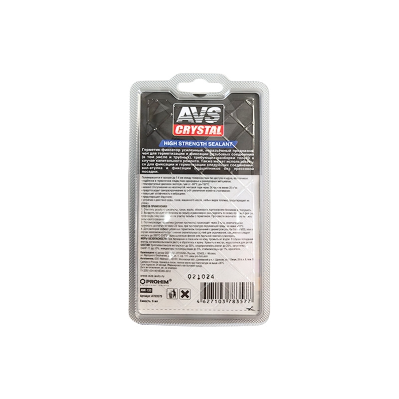 Герметик-фиксатор анаэробный высокопрочный 6 мл AVS AVK-133 предназначен для герметизации и фиксации резьбовых соединений (в том числе и трубных), требующих разборки только в случае капитального ремонта. Также может использоваться для фиксации и герметизации следующих соединений: вал-втулка и фиксации подшипников без прессовой посадки. Полимеризуется в зазорах до 0,4 мм между поверхностями без доступа воздуха, обеспечивая: