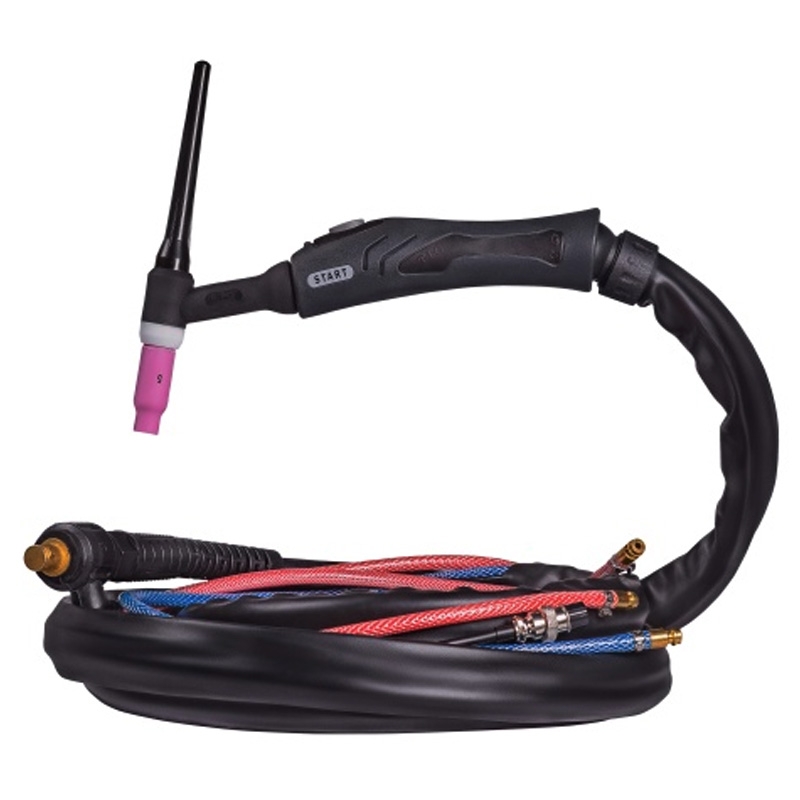 Горелка TIG WP18 F-4м с водой, кнопкой и вентилем предназначена для ручной сварки методом TIG неплавящимся вольфрамовым электродом. Она имеет гибкую головную часть FX, позволяющую производить сварку в различных положениях и ограниченном пространстве. Горелка оснащена газовым вентилем V на рукоятке, что делает её универсальной и позволяет использовать на большинстве сварочных аппаратов различных производителей.