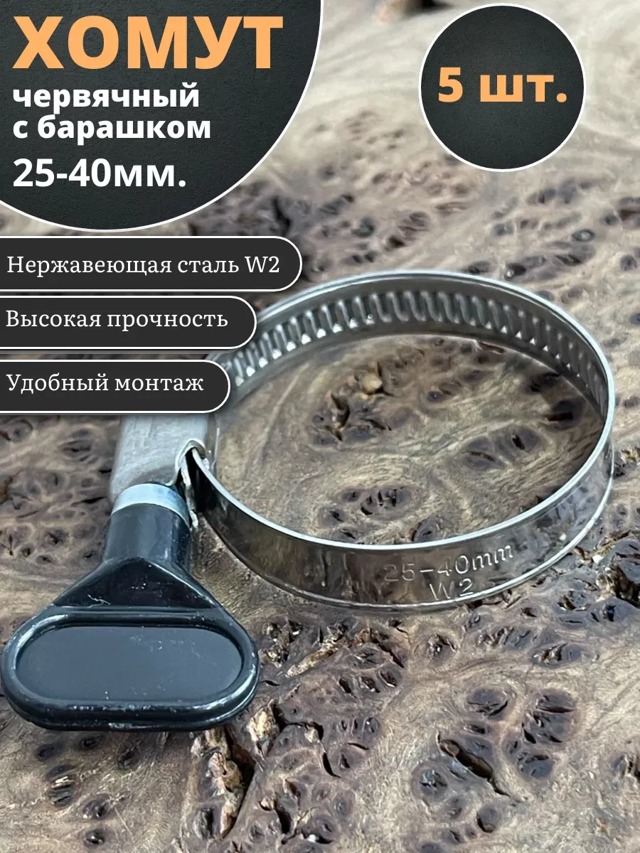 Хомут червячный 25-40 с барашком металлический, 5 шт.