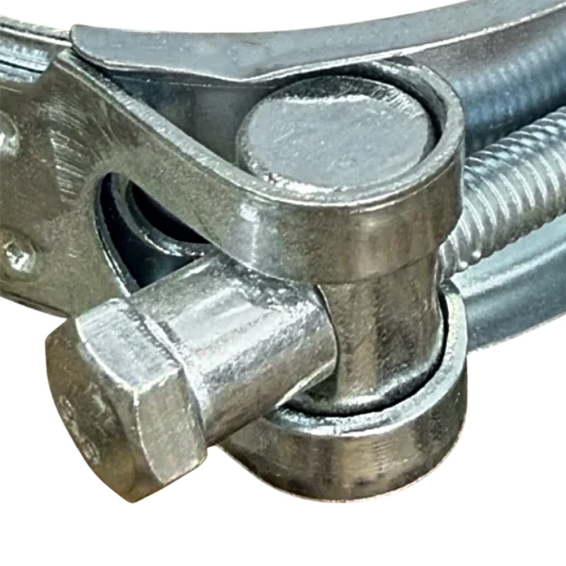 Стальная перфорированная лента с разрезным шарниром и единым болтовым соединением. Затяжка гайки сводит концы ленты, обеспечивая равномерный зажим без локальных деформаций.