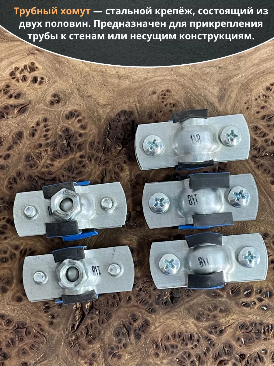 Хомут изготавливается из стали, прокладка - из высококачественной резины. Все металлические детали в обязательном порядке оцинковываются. С помощью трубного хомута трубы могут фиксироваться на полу, стенах или потолке. Данный вид хомута предназначен для надежного крепежа трубопроводов. Используется в сантехническом деле. Пользуется большой популярностью, за счет гарантии надежной фиксации. Материал основания: древесина, металл, бетон, кирпич