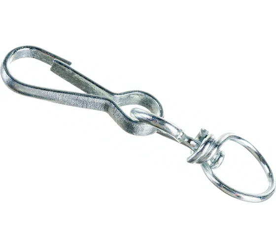 Карабин DIN 4293 тип 125 с вертлюгом для использования в бытовых целях.Применяются для соединения элементов, один из которых длинномерное приспособление (шнур, веревка, лента, стропа). Также карабины с вертлюгом используют в туристических снаряжениях для фиксации легких конструкций, например, ламп в палатке.