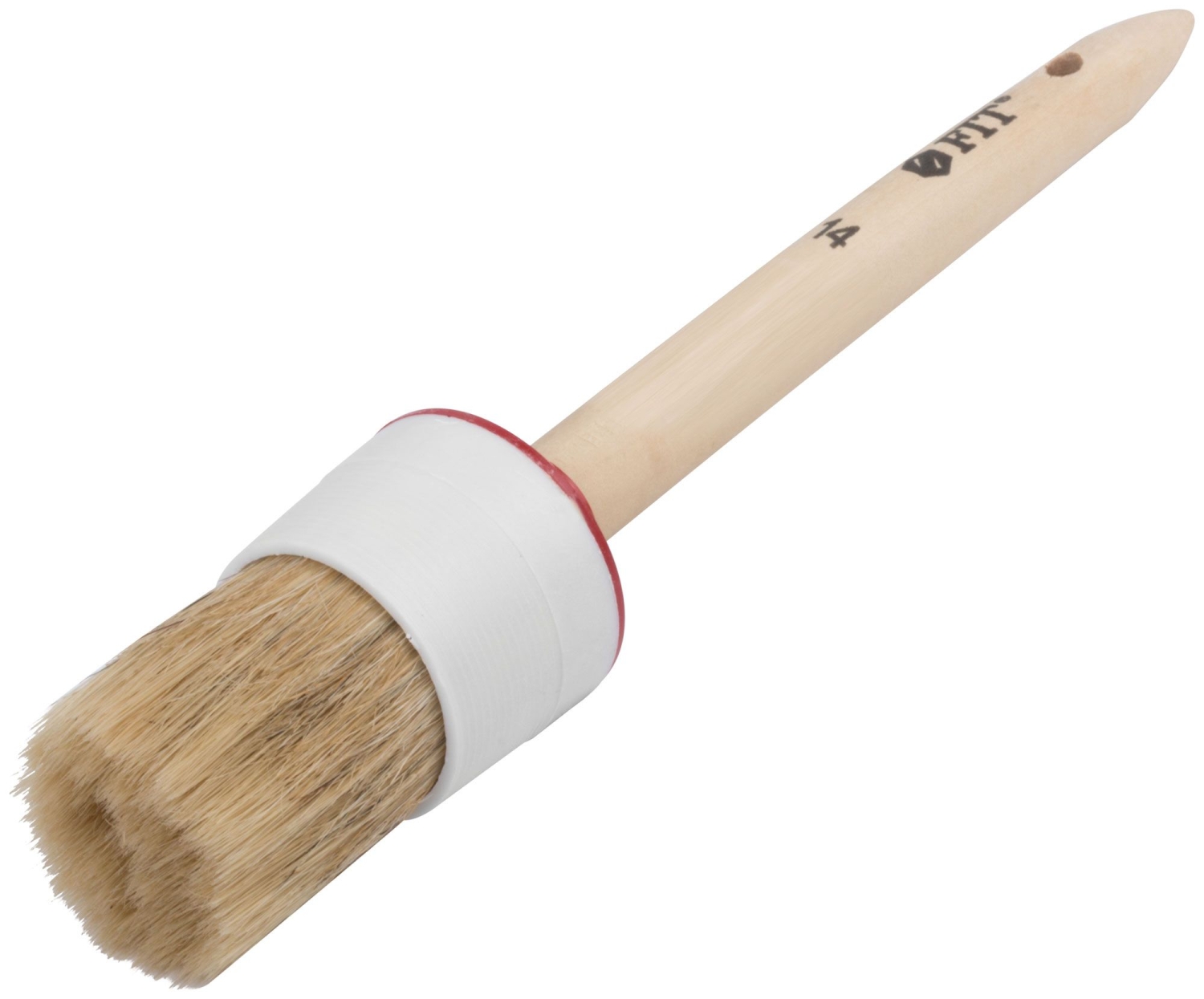Кисть круглая, натуральная светлая щетина №14 (50 мм). Для работы со всеми видами лакокрасочных материалов. Натуральная светлая щетина, пластиковый корпус, деревянная ручка.