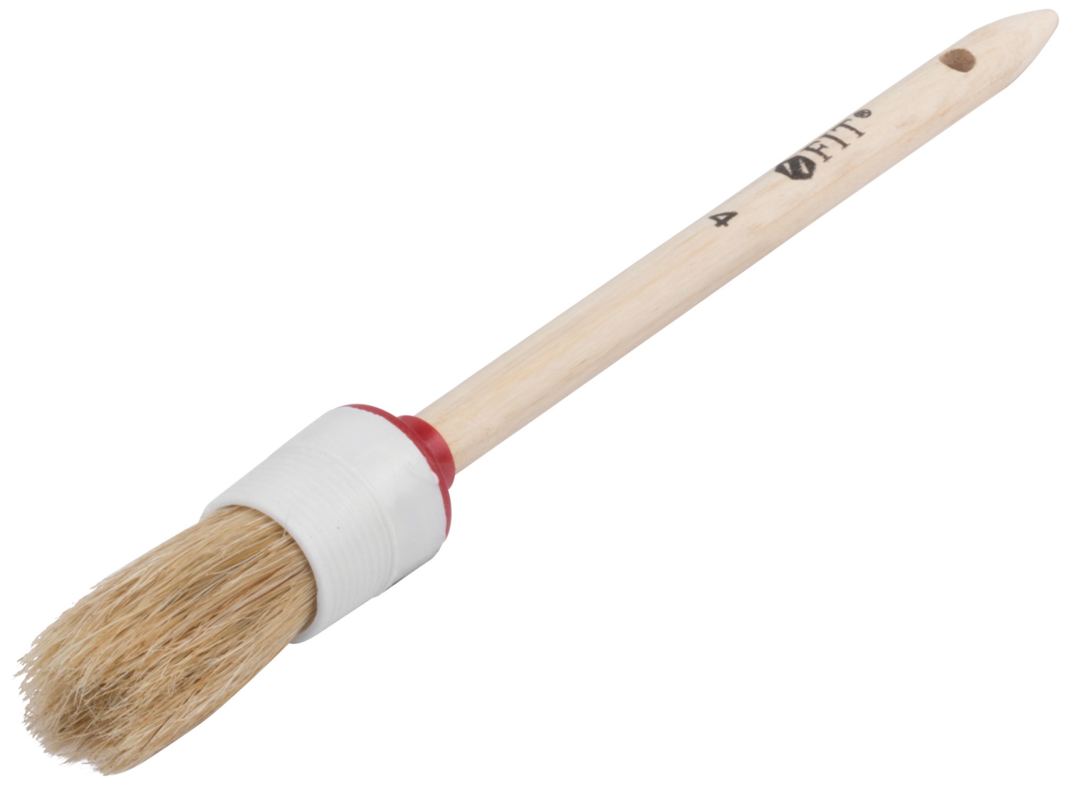 Кисть круглая, натуральная светлая щетина №4 ( 25 мм). Для работы со всеми видами лакокрасочных материалов. Натуральная светлая щетина, пластиковый корпус, деревянная ручка.