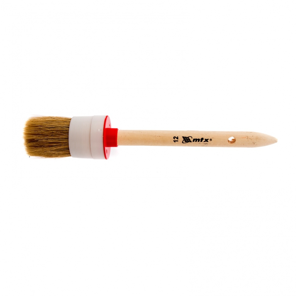 Круглая кисть MTX №12 82082 диаметром 45 мм, с натуральной щетиной и деревянной ручкой, пригодится в быту для окрашивания узких длинных поверхностей. Светлая натуральная свиная щетина с добавлением искусственной обладает высокой износоустойчивостью и может использоваться для нанесения красок с содержанием растворителей, а также масляных красок и лаков.