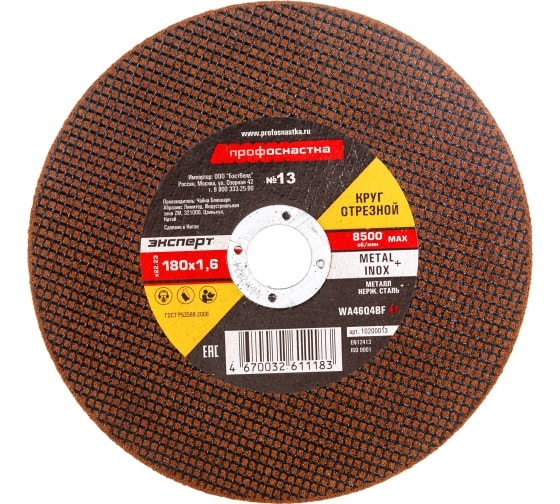 Отрезной круг №13 180*1,6*22 мм тип 41 ТМ Профоснастка предназначен для использования на УШМ. Обеспечивает мягкий рез и имеет высокий коэффициент шлифования (более 1,8) – показатель долговечности ресурса резания. Так же, с учетом цены отрезного диска и его ресурса, низкий показатель стоимости одного реза является наиболее выгодным для сравнения при интенсивном или индустриальном применении. Рекомендуется для резания углеродистых и нержавеющих сталей.