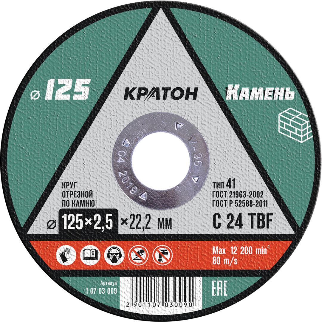 Круг отрезной Кратон предназначен для работ с искусственным и натуральным камнем. Диск относится к абразивной оснастке. Круг подойдет для разных УШМ со стандартным посадочным шпинделем 22,2 мм. Изделие отличается безопасной структурой и прочностью связующего элемента. Диаметр круга составляет 12,5 см при высоте 2,5 мм. Модель круга позволит выпилить нужные отверстия в гранитной столешнице или обработать специальные заготовки из камня.