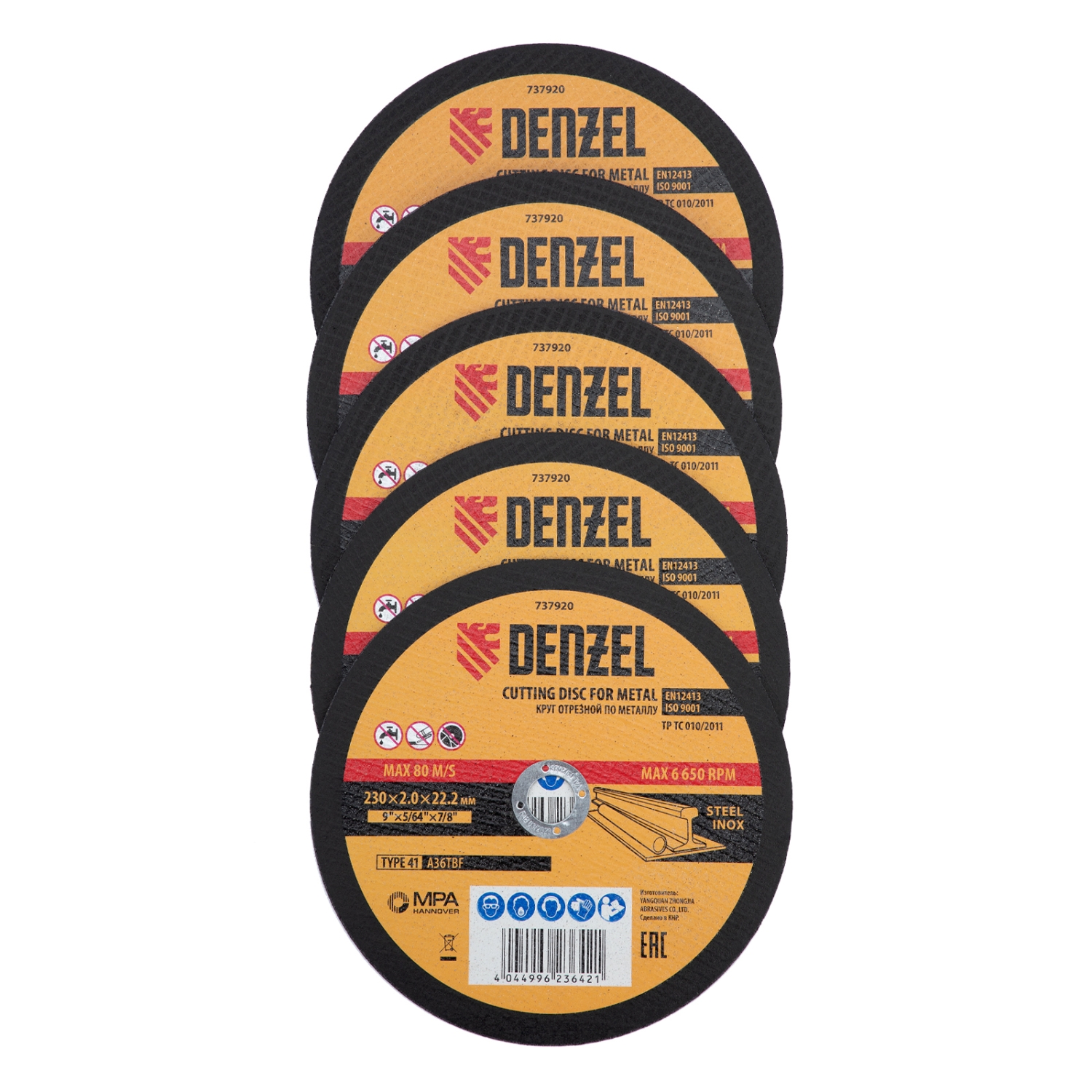 Круг отрезной по металлу Denzel 737920 (A36TBF) размером 230 х 2,0 х 22,2 мм, 5 шт. в металлической банке, устанавливается на УШМ соответствующего типоразмера. Универсальная оснастка подходит для резки легированных (нержавеющих) и углеродистых (черных) сталей. Набор предназначен для профессионального использования и большого объема работ (сухой рез).