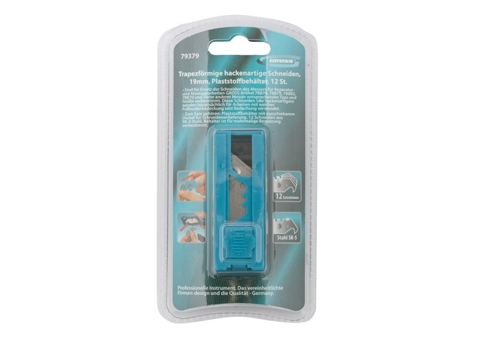 Трапециевидные крючкообразные лезвия Gross 79379 шириной 19 мм, 12 шт., устанавливаются на монтажные ножи подходящего типоразмера - Gross 78876, 78879, 78882, 78870 и другие, кроме арт. 78873 и 78885. Они легко режут ковролин, линолеум и другие мягкие напольные покрытия, оптимальны для использования во время ремонта.