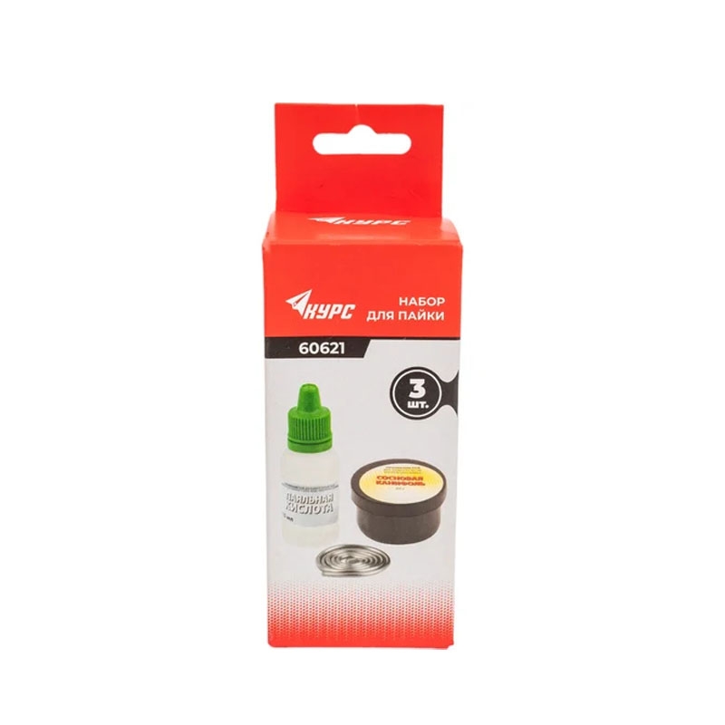 Набор для пайки №1 (припой ПОС-61 10 гр.; канифоль сосновая 20 гр.; кислота паяльная 15 мл) для проведения паяльных работ. Паяльная кислота (высокоактивный флюс на основе хлористых солей цинка) предназначена для пайки и лужения стали, чугуна, латуни, железа, бронзы, меди, никеля, серебра и др.