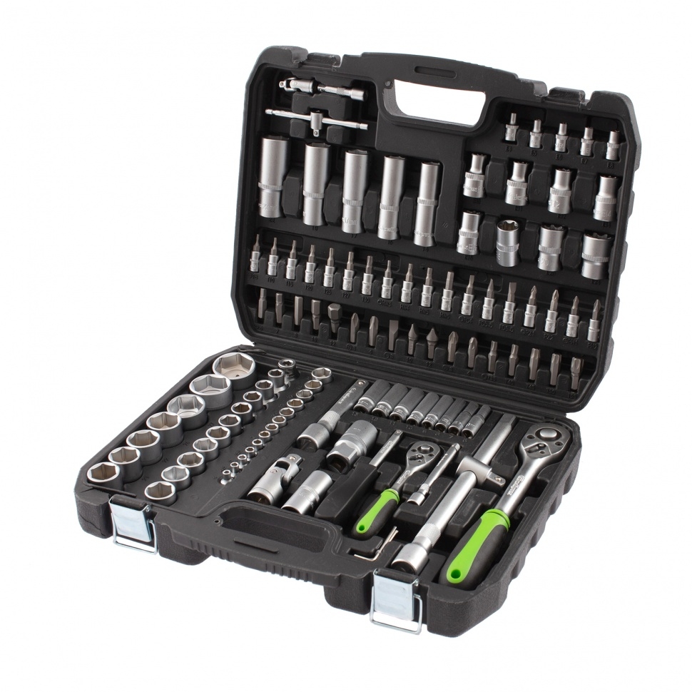 Набор инструмента Сибртех 13498, 1/2 и 1/4 дюйма, состоит из 108 предметов и предназначен для ремонта и обслуживания автомобилей, а также выполнения бытовых работ. Имеющиеся в комплекте насадки рассчитаны на крепеж с различными типами профилей и шлицев, включая HEX и TORX. Набор будет полезен профессиональным мастерам и автолюбителям. Преимущества Все элементы набора изготовлены из высокопрочной инструментальной стали и выдерживают активное использование. Матовое антикоррозийное покрытие предохраняет инструменты от ржавчины, продлевая срок их службы. Трещоточные ключи с защитным покрытием обладают повышенной износоустойчивостью. Флажковый переключатель каждого ключа позволяет мгновенно изменять направление вращения трещотки. Шаг трещоток с 45 зубцами составляет 8 градусов, что облегчает работу в ограниченном пространстве. Удлинители, карданы и удлиненные торцевые головки обеспечивают доступ к крепежам в труднодоступных местах. Набор упакован в кейс из ударопрочного пластика.
