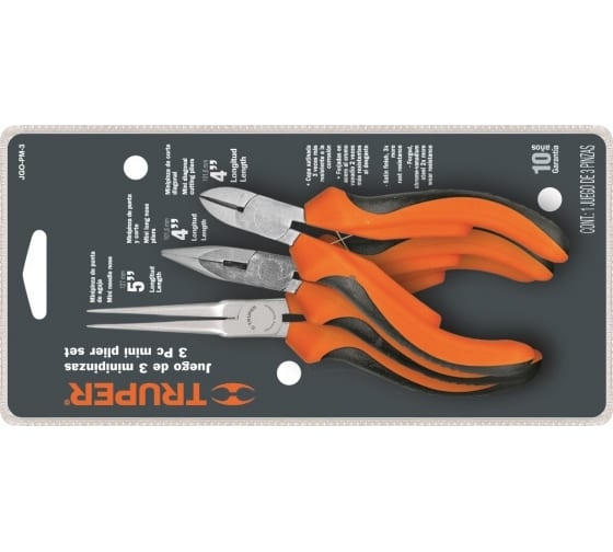 Набор миниплоскогубцев 3 шт Truper JGO-PM-3 18215 - это функциональный и практичный набор шарнирно-губцевого инструмента, который позволяет удерживать или перекусывать мелкие детали, проволоку и кабель. Рабочая часть кованная, она изготовлена из хромванадиевой стали, которая обладает повышенной твердостью. Двухкомпонентные рукоятки не скользят в руке, снижая нагрузку на кисть при длительном применении.