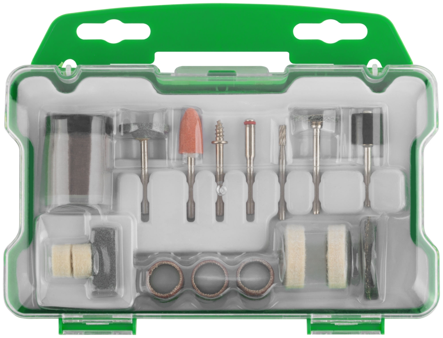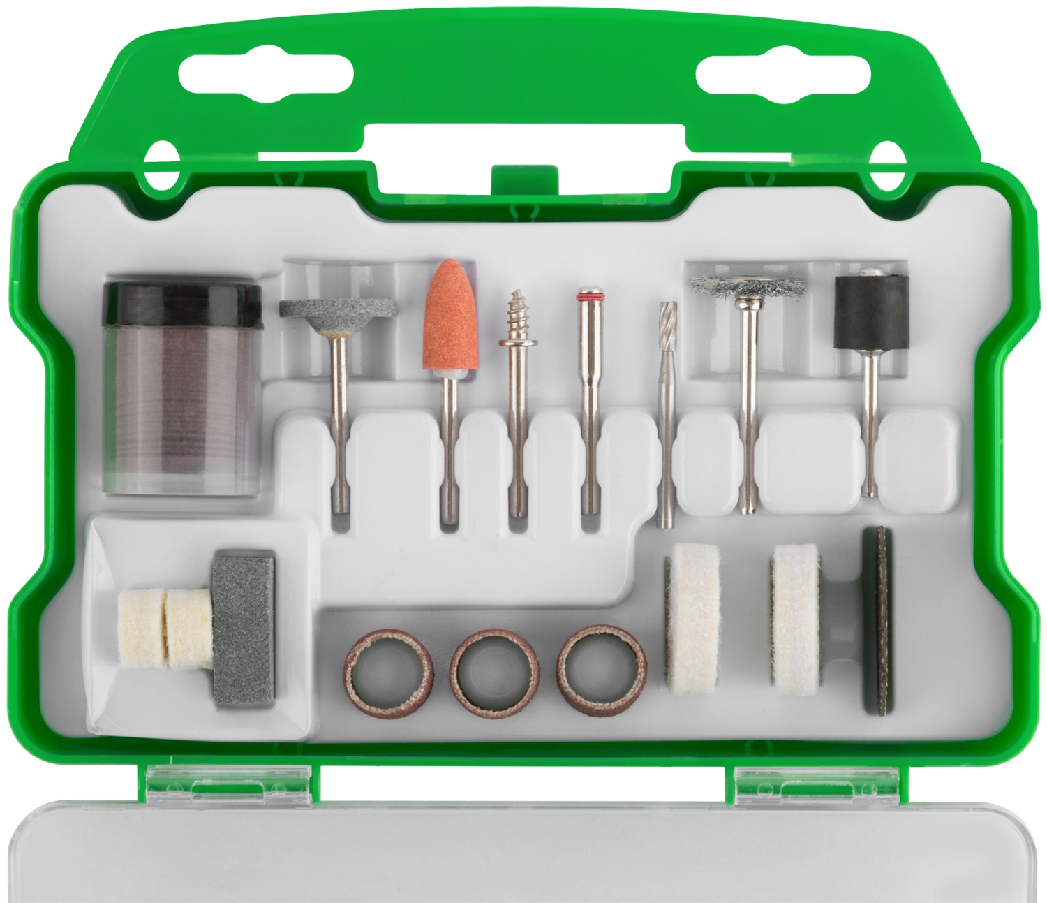 Для гравировальной машины. Для обработки различных материалов. В наборе: фетровые насадки, штифты для фетровых насадок и отрезных кругов, держатель для наждачных трубок, наждачные трубки, мини корщетка-насадка тип «колесо», шарошки-мини по металлу, круги отрезные абразивные. Упаковка: пластиковый кейс.