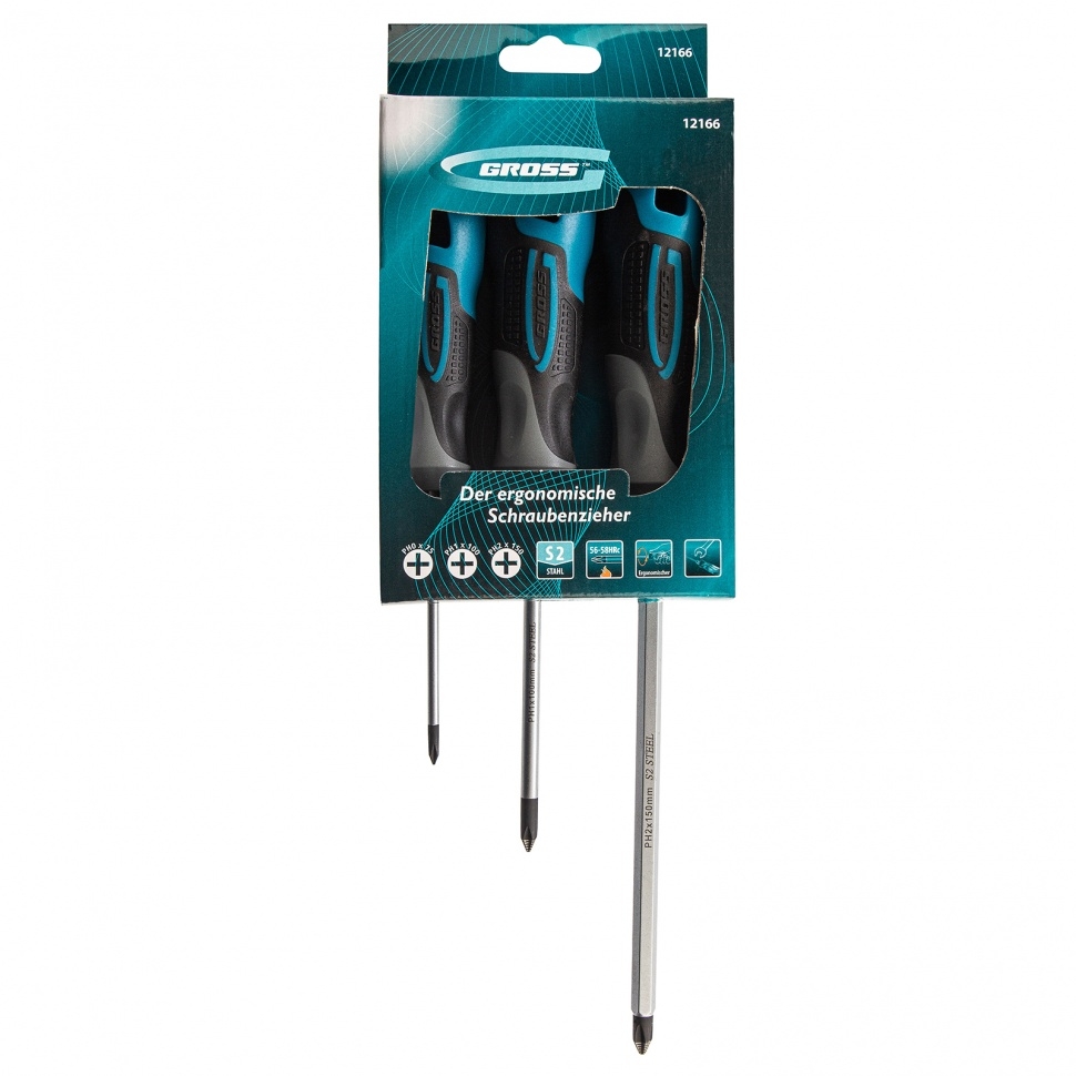 Набор отвёрток 3 шт S2 GROSS 12166 применяется для монтажных и ремонтных работ. В набор входит три стальных отвертки( PH 0 х 75, PH 1 х 100, PH 2 х 150), которые имеют эргономичную рукоятку, стержень с намагниченным наконечником и насечками. Имеется силовой элемент "под ключ".