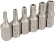 Вставки изготовлены методом холодной штамповки из инструментальной стали S2, закалены до твёрдости 55-60 HRC и защищены от коррозии фосфатированием Рабочий профиль вставок - внешний Torx® с отверстием Длина вставок - 30 мм Комплектация набора: Вставки Torx® L-30 мм - Т20, Т25, Т30, Т40, Т45, Т50 Индивидуальная упаковка - блистер.