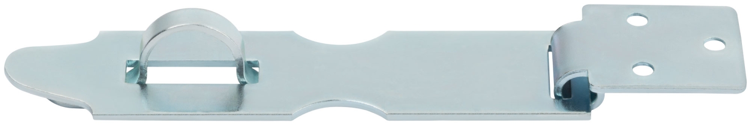 Простая стальная пластина с петлевым механизмом для цепляния замка, покрытая цинком для стойкости к ржавчине и внешним воздействиям. Компактный размер облегчает установку на разные типы дверей.