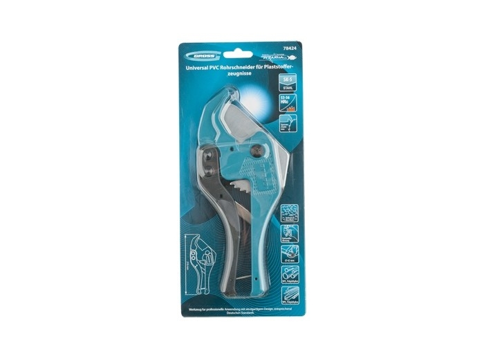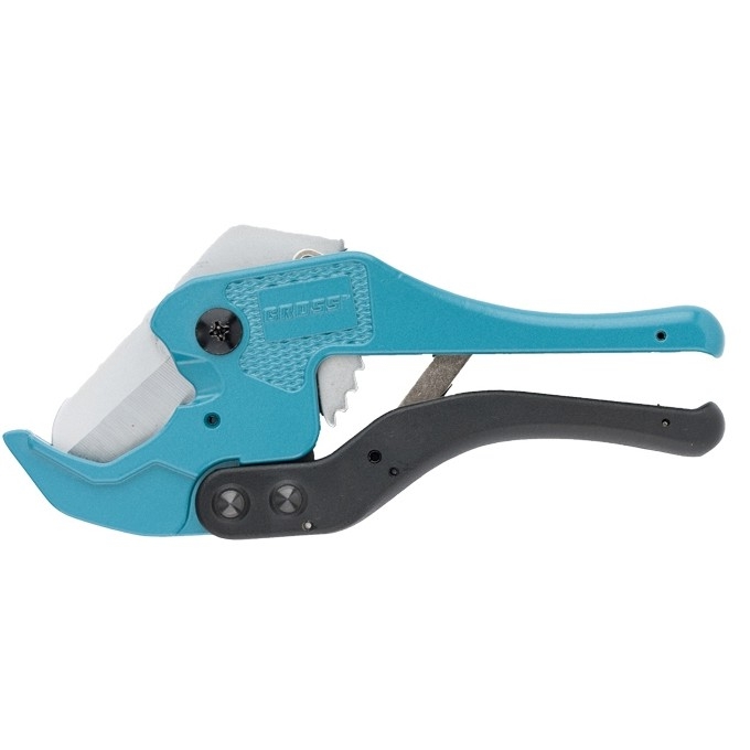 Универсальные ножницы для резки изделий из ПВХ Gross 78424 с порошковым покрытием рукояток применяются для разрезания пластиковых труб диаметром до 42 мм, а также профилей, плинтусов, галтелей, реек, планок, резиновых шлангов и других предметов. Нож у инструмента прямой, поэтому он может резать плоские заготовки. Ножницы пригодятся для выполнения сантехнических и отделочных работ. Преимущества Режущее полотно устойчиво к износу, т.к. изготовлено из высокопрочной японской стали SK-2. Инструмент не подвержен коррозии, поскольку его лезвие хромировано, а корпус защищен порошковым покрытием. Работа с ножницами долго не вызывает усталости благодаря модернизированному храповому механизму. Ножницы удобны в хранении и транспортировке за счет блокировки рукояток в сведенном положении.