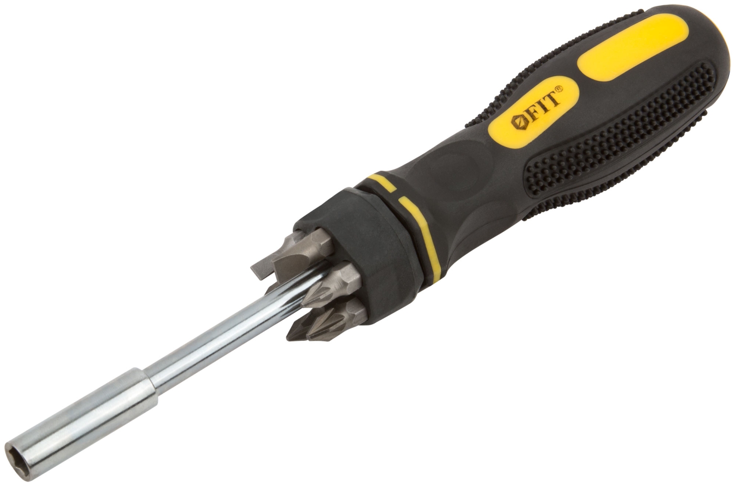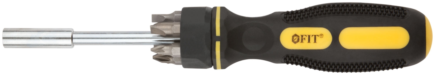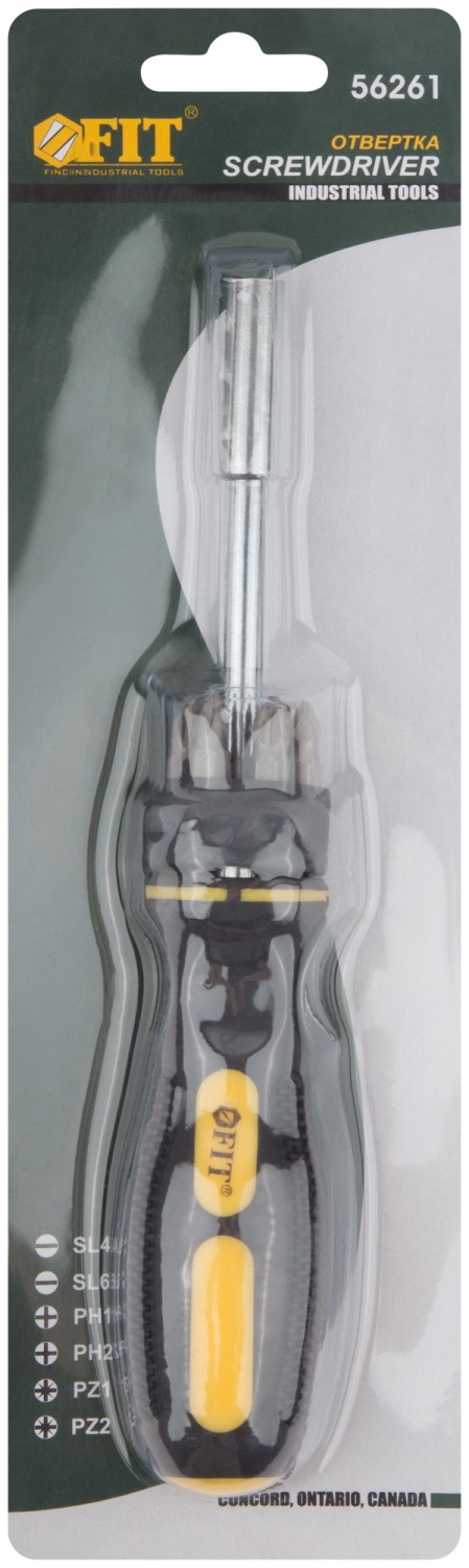 Отвертка для бит, жало из хром-ванадиевой стали, магнитный фиксатор бит + биты РН1 / РН2 / PZ1 /PZ2 / SL4 / SL6 из CrV стали. Упаковка: блистер.