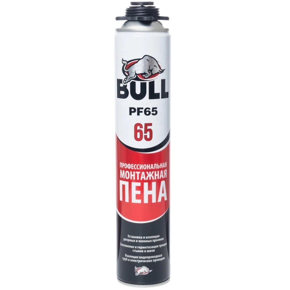 Профессиональная монтажная пена Bull PF 65 профессиональная полиуретановая монтажная пена Полиуретановая монтажная пена это однокомпонентная полиуретановая пена, застывающая под воздействием влаги воздуха, специально рекомендована для широкого спектра применений в области профессионального монтажа, герметизации и изоляции в строительстве. Использование пистолета обеспечивает точность нанесения, скорость работы и повышенный выход пены.