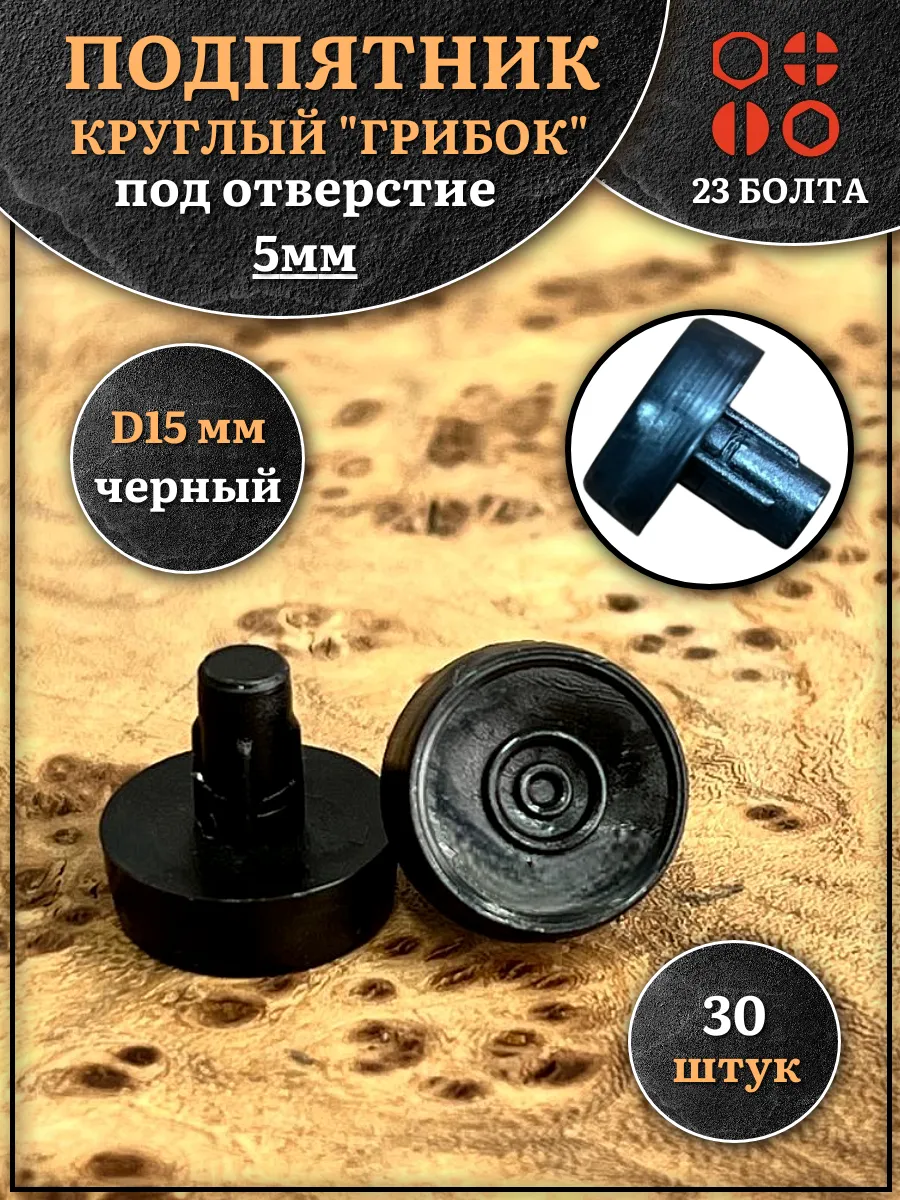 Подпятник гриб мебельный d 15 мм под отверстие 5 мм, 30шт
