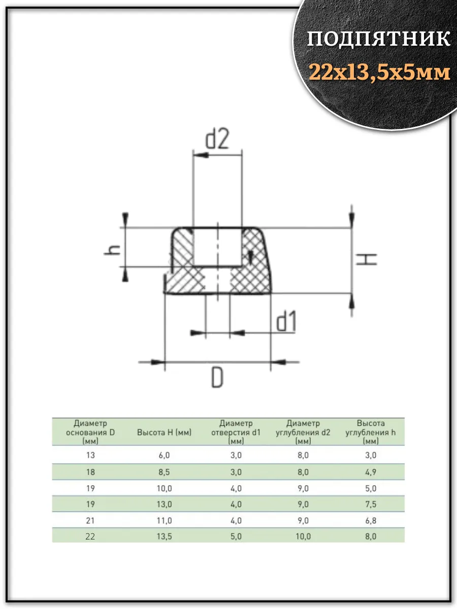 | Подпятник круглый мебельный с отверстием 22х13,5х5 мм, 50 шт | 18-0240ф50 | 1 шт. |
