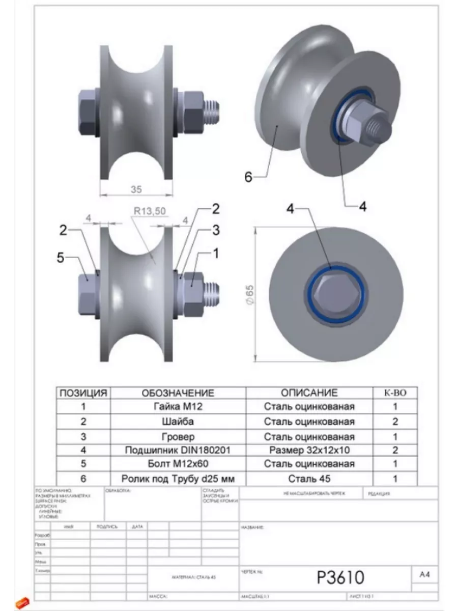 Ролик для ворот Р3610, d65мм под трубу 3/4 d25, металл 2 шт.