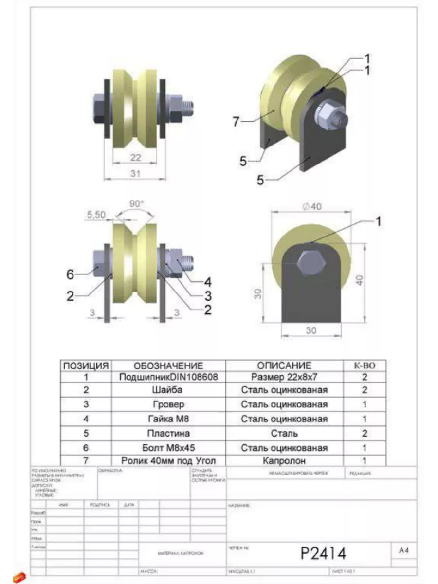 Ролик на пластинах d40мм, под угол ,капролон 4 шт.