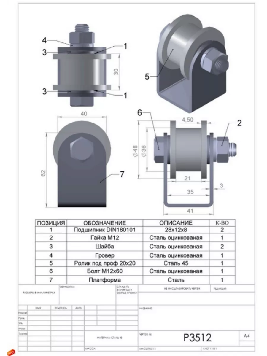 Ролик на платформе d 50 мм, под трубу 20х20,металл 4 шт.