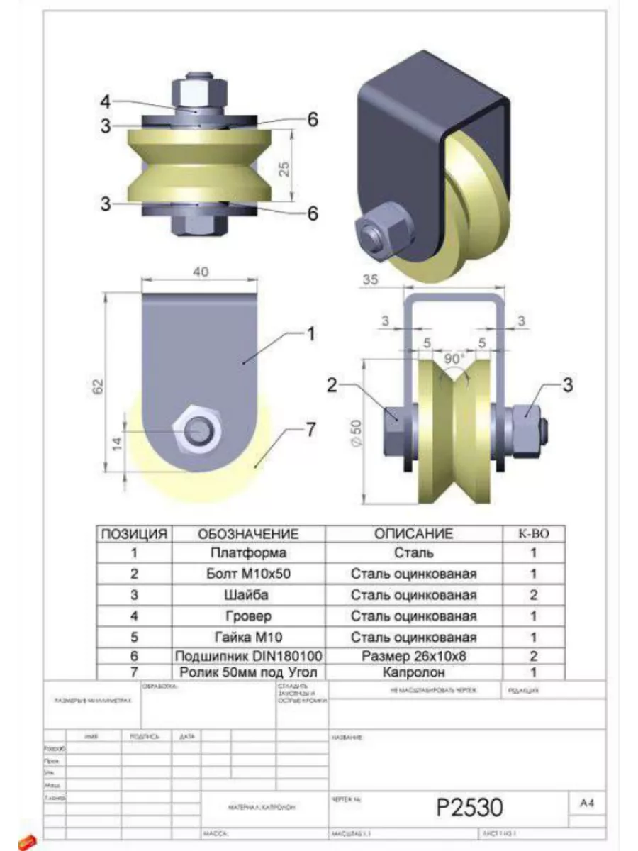 Ролик на платформе d50мм, под угол ,капролон 4 шт.