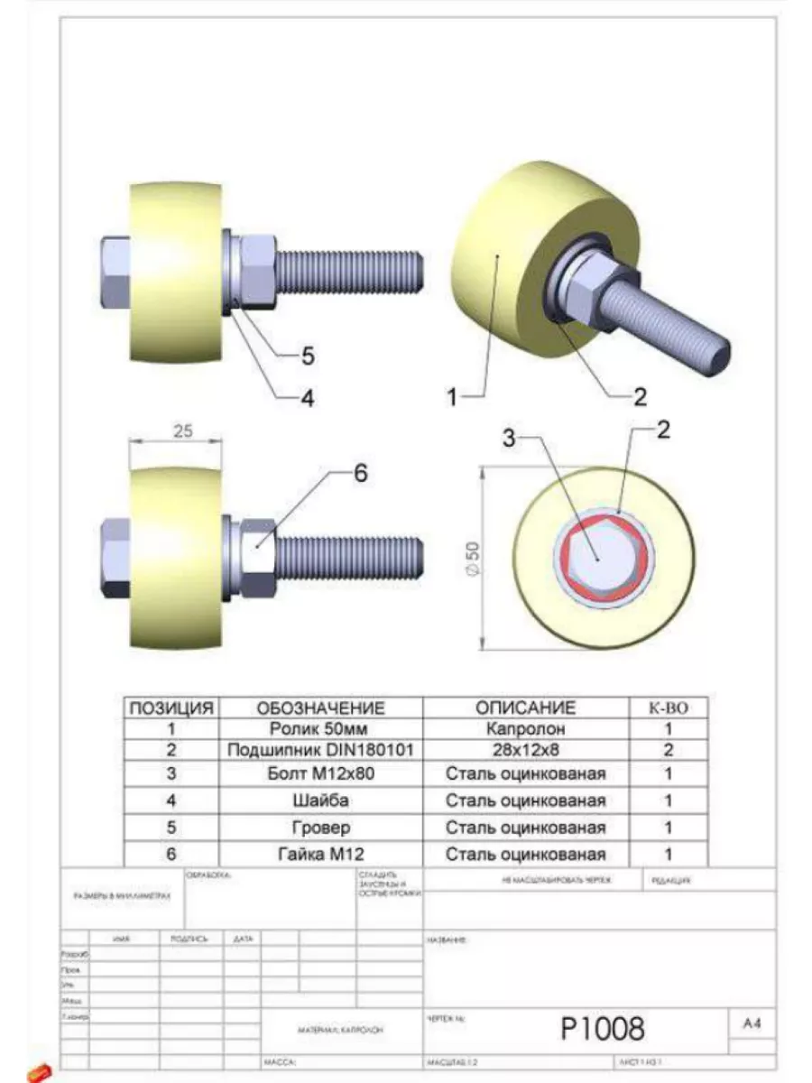 Ролик поддерживающий d 50 мм на болту М12, капролон, 4 шт.