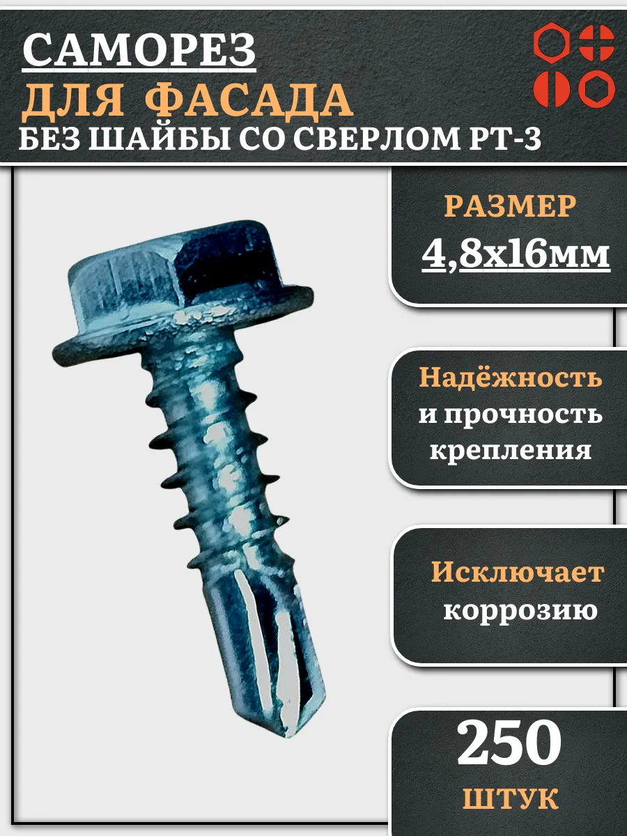 Саморез без шайбы для фасада со сверлом 4,8х16 РТ-3, 250 шт.