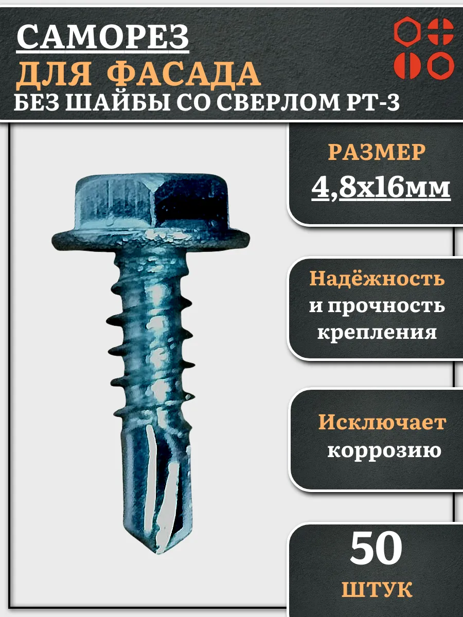 Саморез без шайбы для фасада со сверлом 4,8х16 РТ-3, 50 шт.