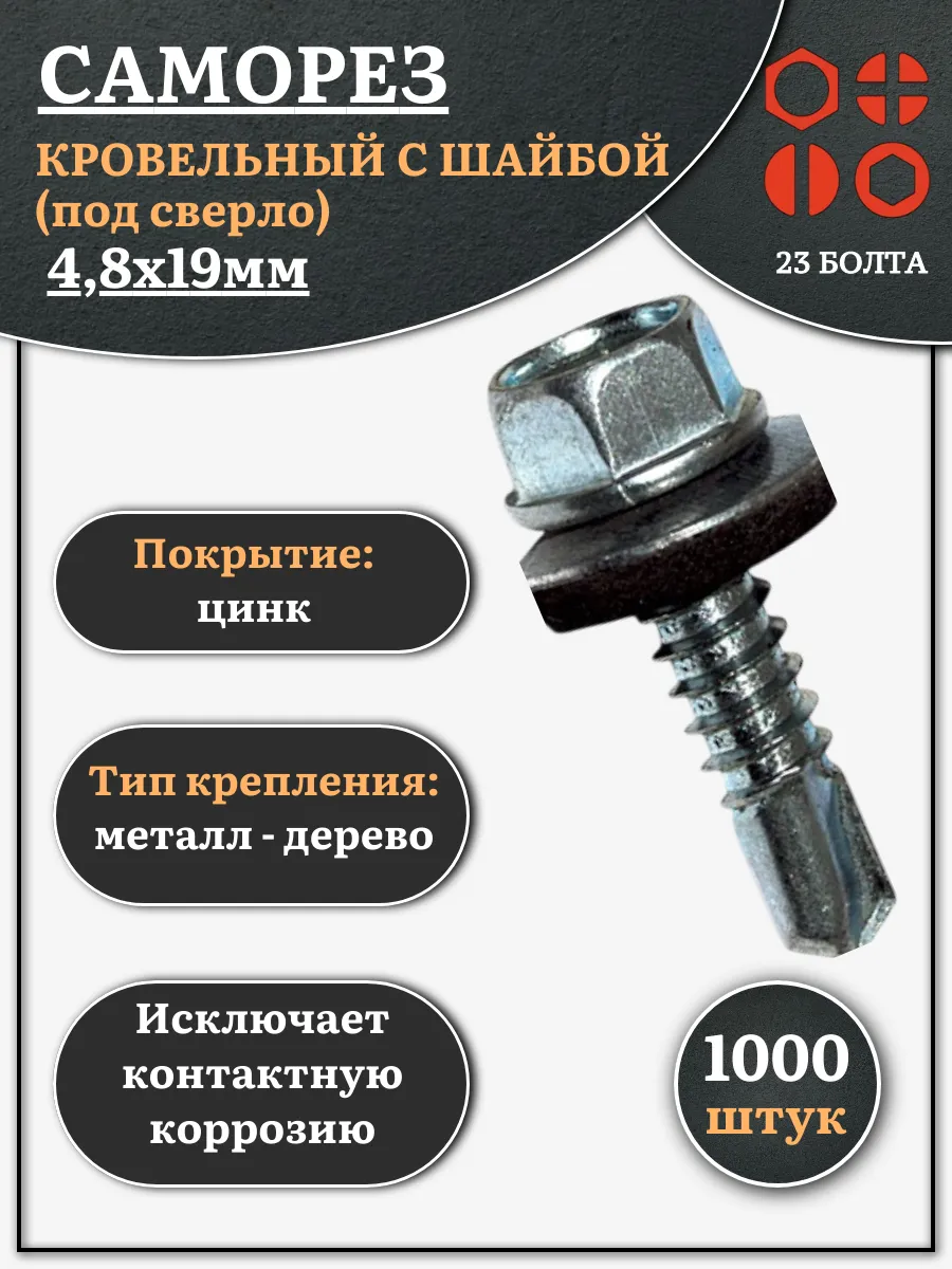 Саморез кровельный 4,8х19 мм с шайбой (под сверло),ОЦ 1000шт.