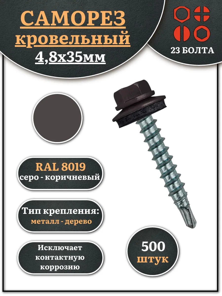 Саморез кровельный, 4,8х35 серо-коричневый RAL8019 500 шт