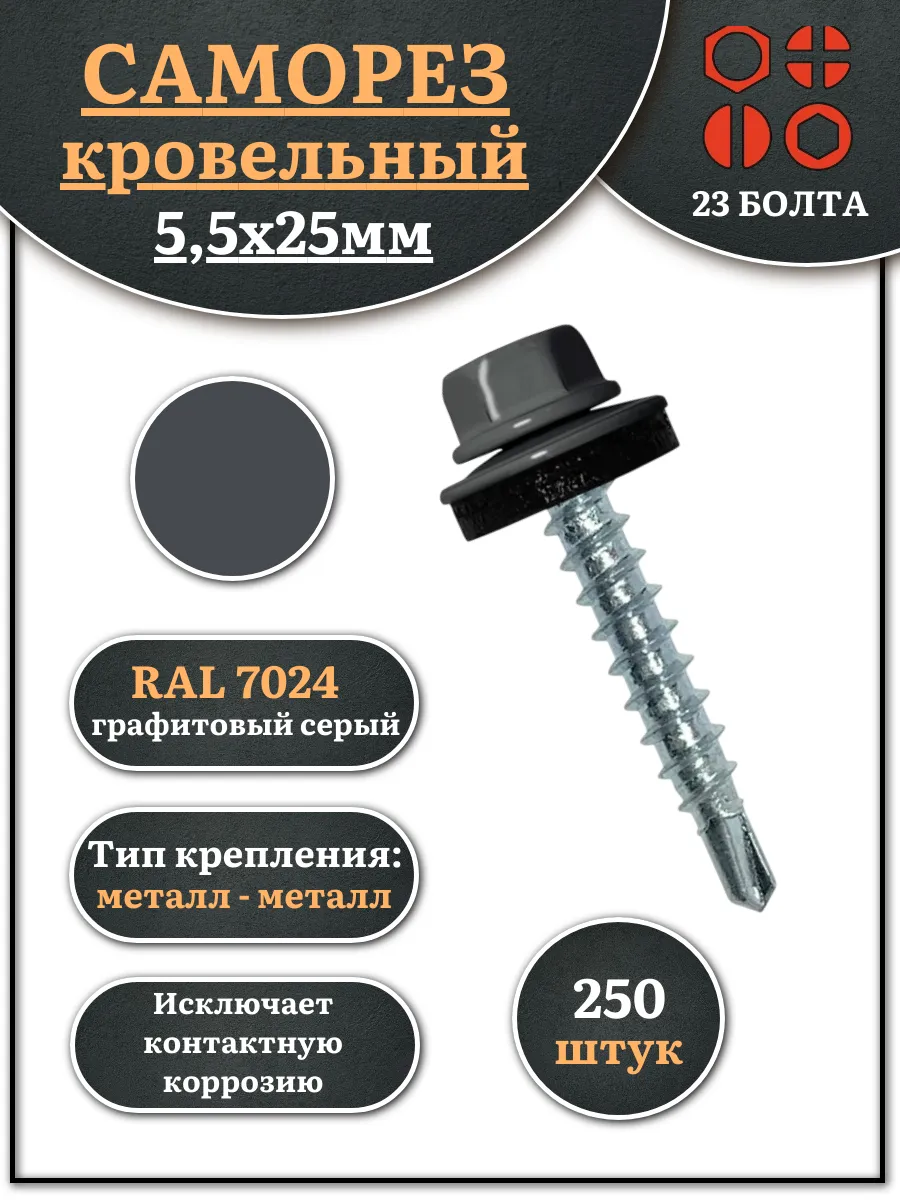 Саморез кровельный, 5,5х25 графитовый серый RAL7024 250 шт