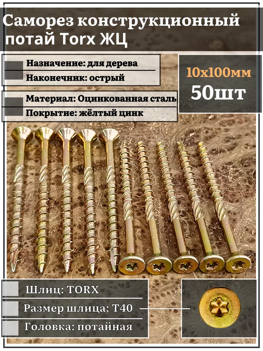 Саморез по дереву потайной Torx 10х100 ЖЦ, 50 шт.
