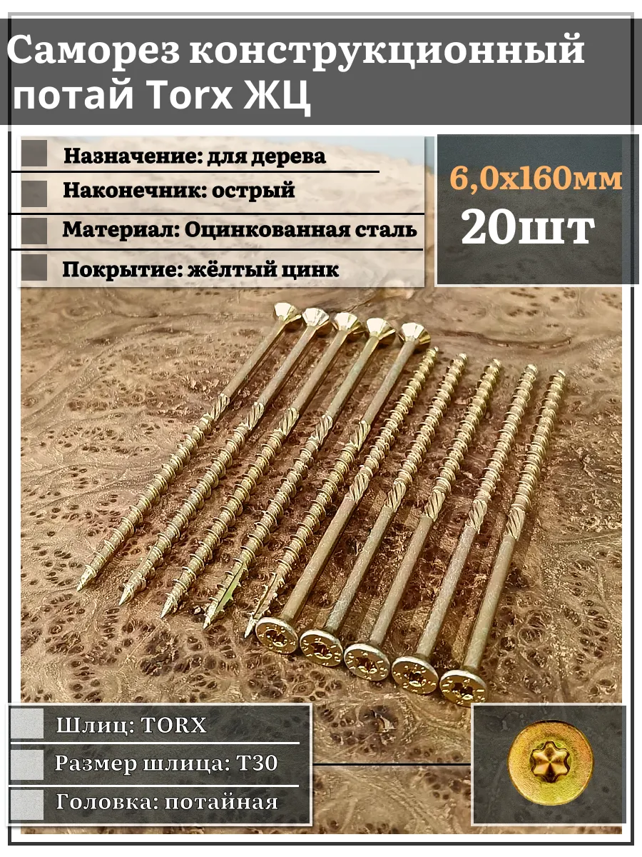 Саморез по дереву потайной Torx 6х160 ЖЦ, 20 шт.