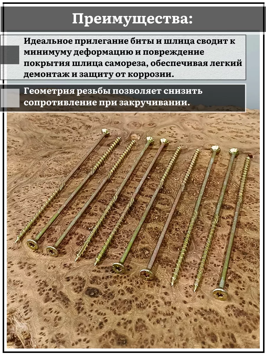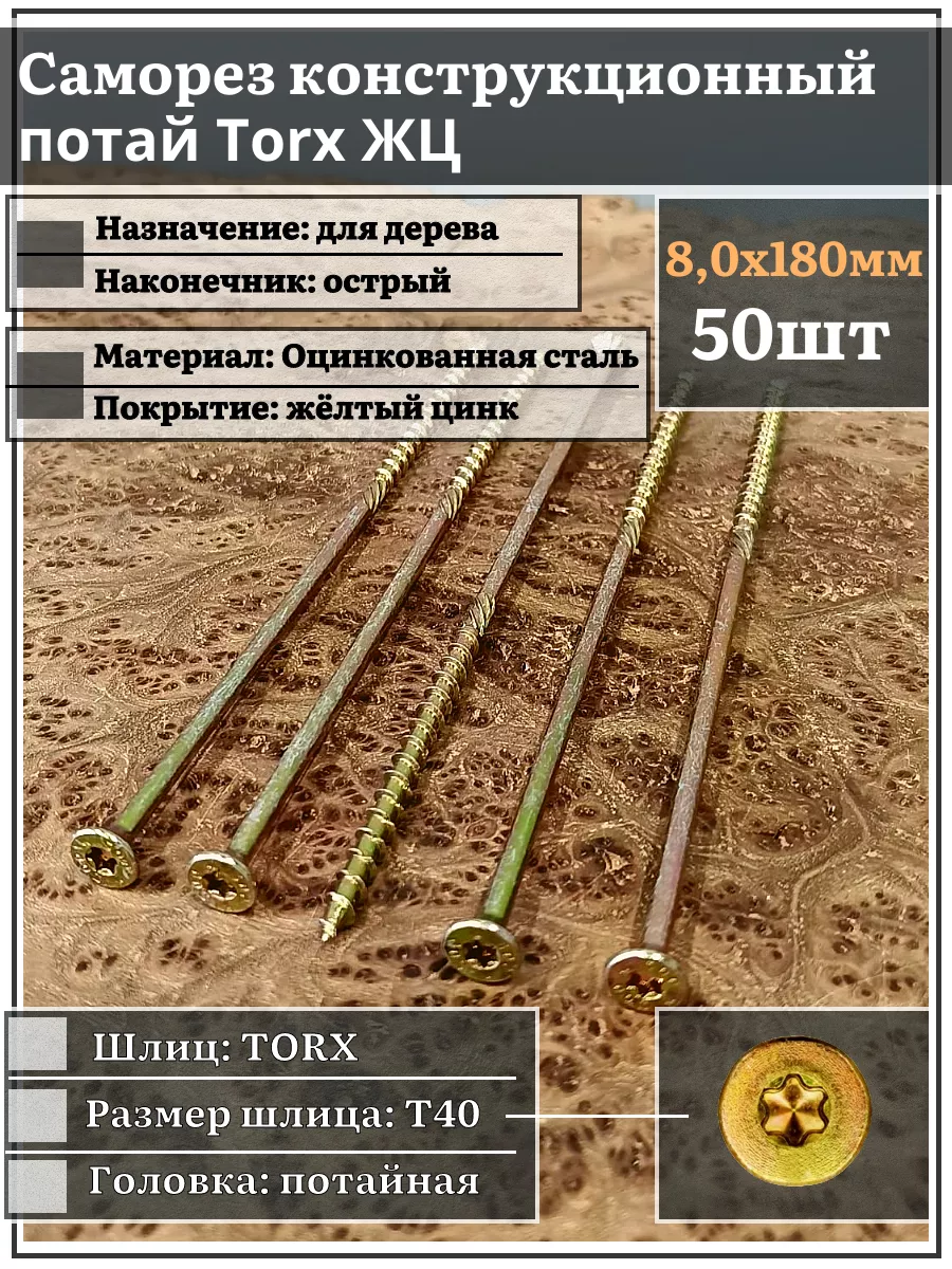 Саморез по дереву потайной Torx 8х180 ЖЦ, 50 шт.