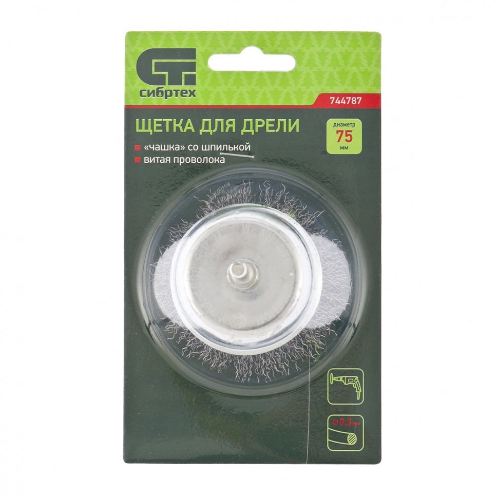 Щетка для дрели "чашка", со шпилькой, вит.проволока 0,3мм, 75 мм Сибртех