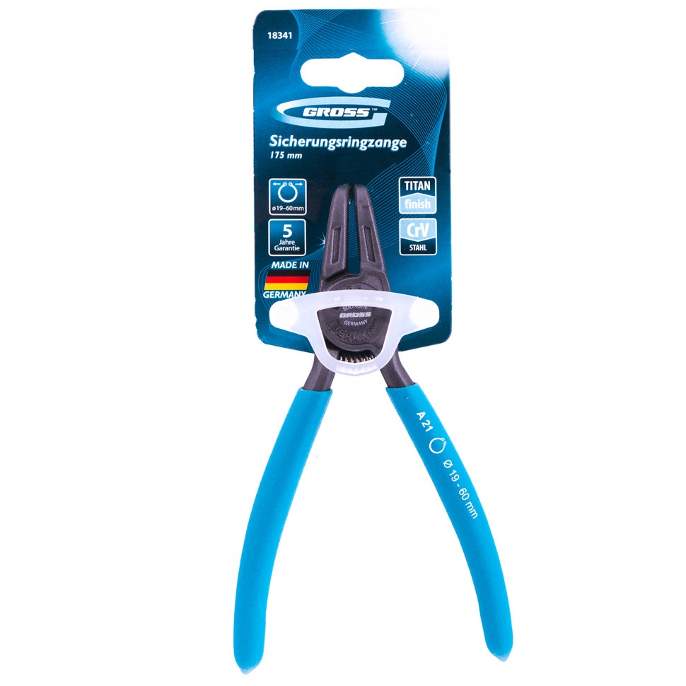 Съемник Gross 18341 длиной 165 мм, с изогнутыми губками, работает на разжим внешних стопорных колец диаметром 19-60 мм с целью их монтажа или демонтажа. Имеет наконечники диаметром 1,8 мм и применяется для колец с проушинами соответствующего размера. Изогнутые губки упрощают работу в труднодоступных местах. Съемник стопорных колец пригодится для ремонта а