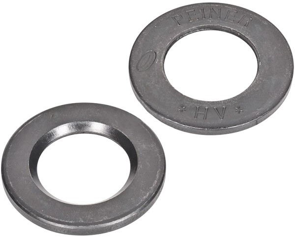 Шайба закаленная плоская с фаской DIN 6916 - специальный крепежный элемент повышенной твердости для высокопрочных предварительно нагруженных болтовых соединений (HV) с диаметром резьбы от М12 до М36 и увеличенными размерами под ключ. Используется для увеличения опорной поверхности резьбового крепежа, что позволяет приложить большое усилие затяжки. изготавливается из углеродистой стали С45 с дополнительной закалкой и отпуском до твердости 300HV, антикоррозийного покрытия не имеет,.