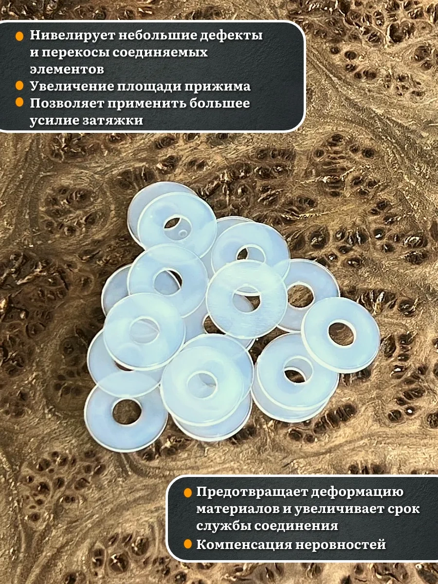 Белая полиамидная шайба DIN 9021 не вызывает коррозии, устойчива к ультрафиолетовому излучению и практически не подвержена старению. Это обеспечивает прочность и долговечность всего крепёжного узла.