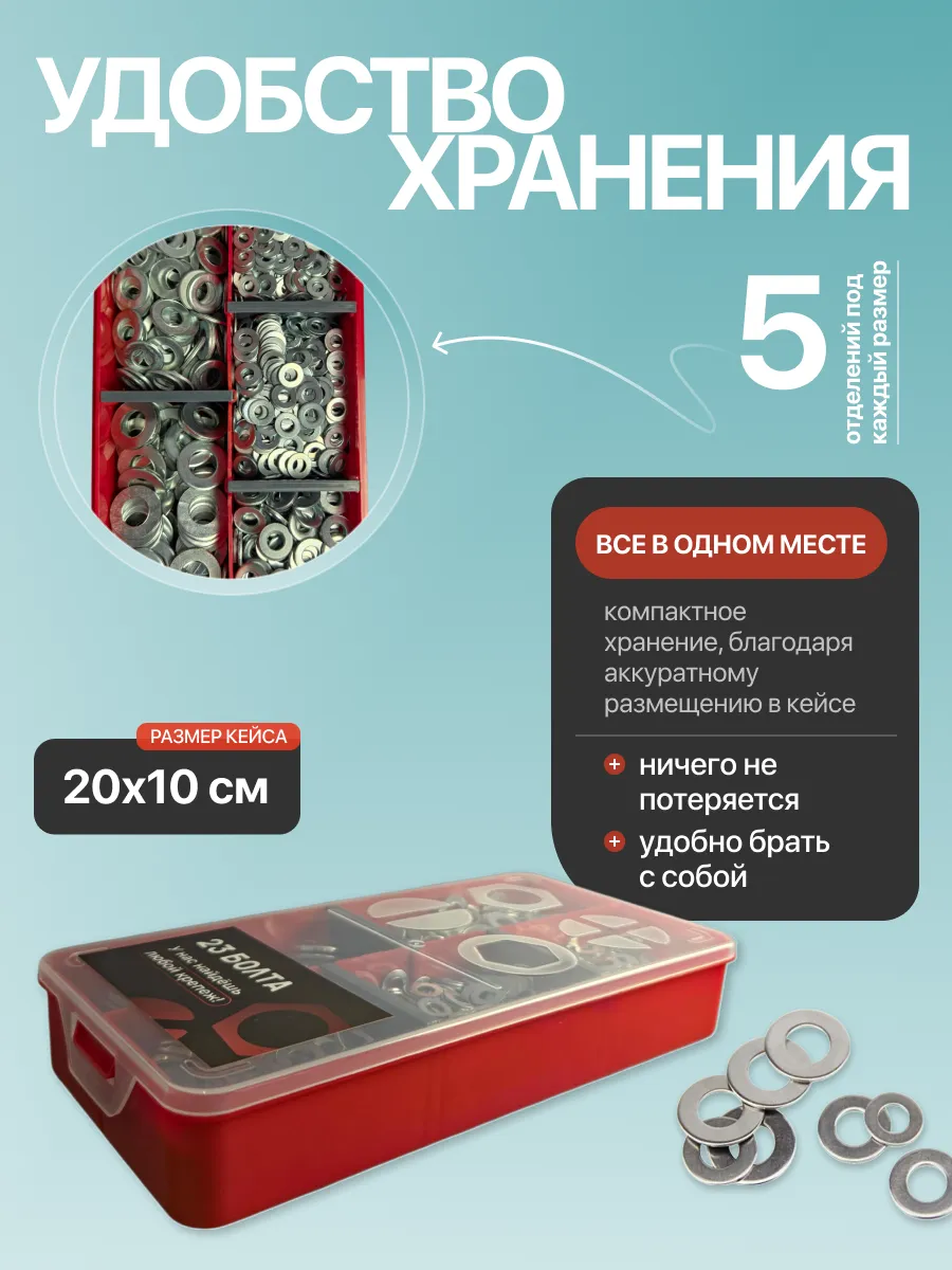 Отличный комплект.Шайбы чистые, без заусенцев, покрытие ровное. Главный плюс-это органайзер: защелки плотные, размеры не перемешиваются при переноске.
