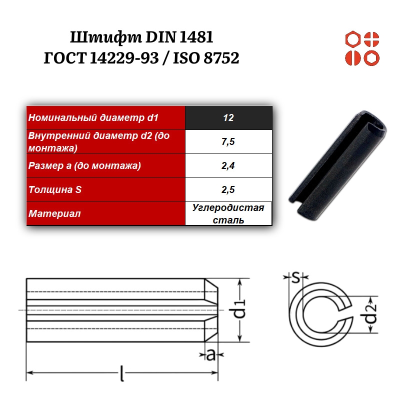Штифт пружинный DIN 1481 12х20 / ГОСТ 14229-93 / ISO 8752, 200 шт.
