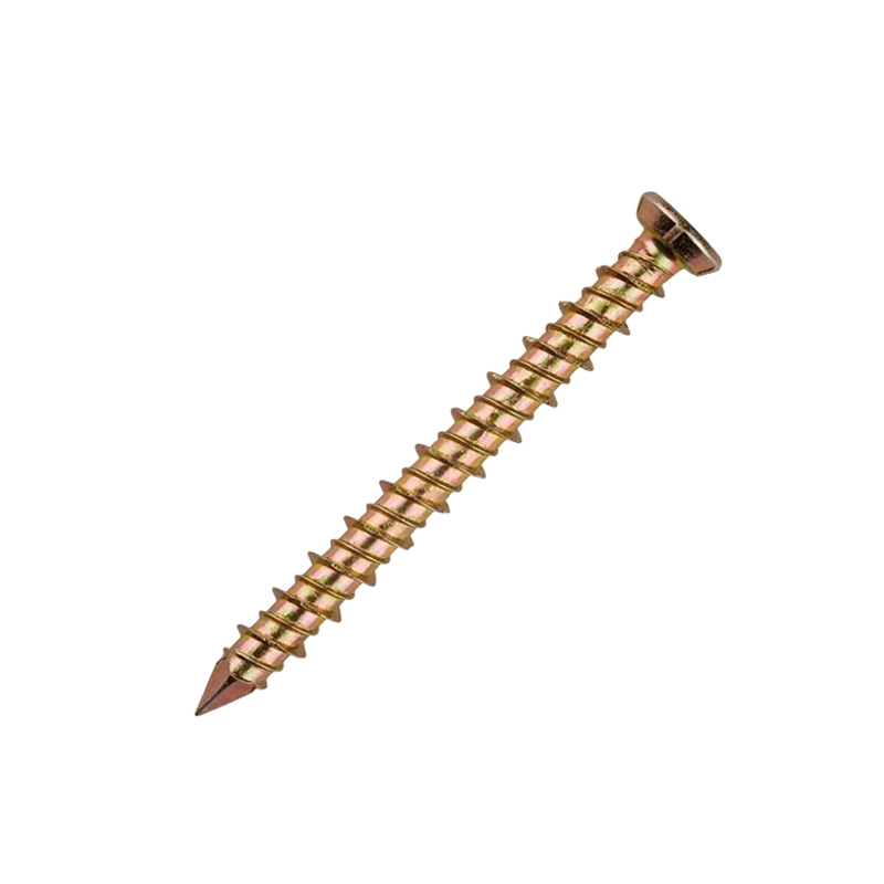 Саморез-шуруп "Бетон Нагель" с потайной головкой, с насечками и шлицем TORX. Шуруп широко используется в строительстве и при проведении ремонтно-отделочных работ. Часто применяются для крепления оконных рам и дверных коробок. Данный саморез изготавливается из стали и потом покрывается желтым цинком. По всей длине стержня расположена острая попеременная резьба. Шуруп имеет острый наконечник и потайную шляпку. Для работы с данной моделью шурупа необходима бита TORX. Материал основания: бетон, природный камень, кирпич.